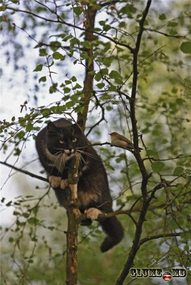 Pisica - şmecheră sa urcat după vrăbiuţă