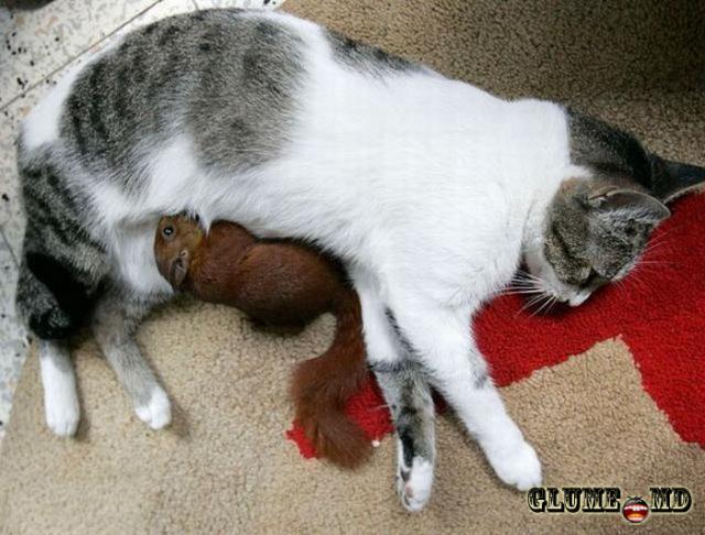 Pisica - o hrăneşte pe veveriţă